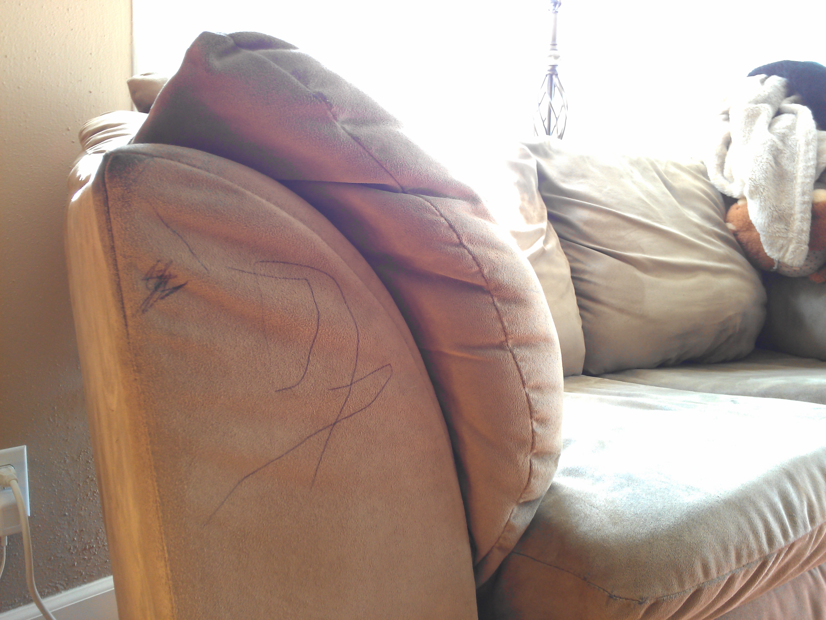 I turn around from changing Caleb’s diaper and see the scribbles and my daughter holding a pen with the “I know I did something wrong” look on her face. I also see the loveseat desecrated. Black scribbles are pronounced across the side corner of the loveseat and one of the cushions. Here’s what goes on in my heart, before I address my daughter: “Oh no! I have no idea how to get pen out of microfiber! Is it possible? Can I google it? I’m upset! I hate that the loveseat looks dirty & used now! I can’t fix it! We can’t afford to buy a new loveseat for years. I am going to have to stare at these ugly scribbles for years.”